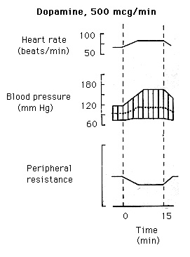 La dopamina (DA) es un agonista de los receptores D1 y un agonista menos potente de los receptores b1-adrenérgico. A altas concentraciones puede actuar como agonista en a-adrenoceptores y puede, además promover la liberación de NOR desde el terminal simpático. Los receptores D1 provocan una vasodilatación renal y de los lechos mesesentérico y coronario. El resultado es que la DA disminuye la resistencia vascular y aumenta la presión de pulso y presión media. El efecto cronótropo positivo de la DA produce un pequeño incremento de la frecuencia cardíaca.