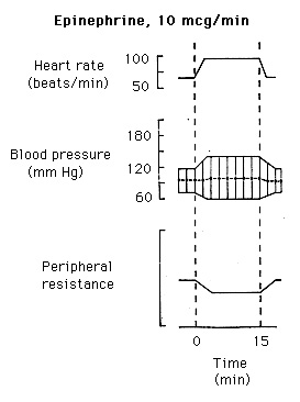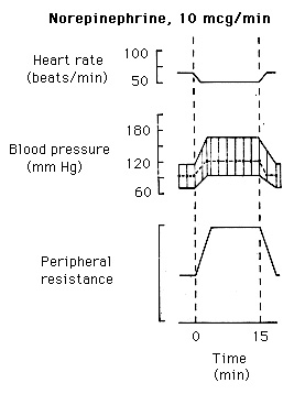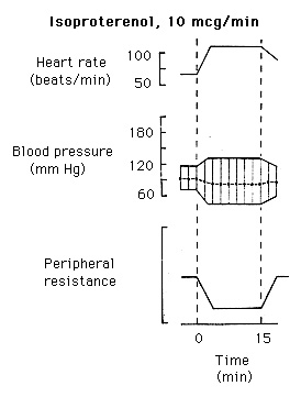 El resultado mostrado aquí es una leve disminución en la resistencia periférica, un incremento en la presión de pulso con poco o ningún cambio en la presión media sanguínea . Debido a que que la presión media sanguínea no cambia, son evidentes los efectos cronótropo e inótropo.
