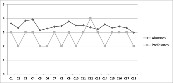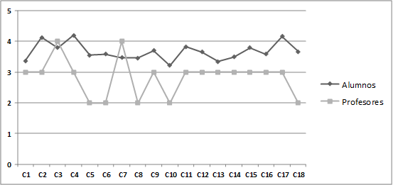 Dentro de las competencias específicas, en los cursos 2013-14 y 2014-15 (Figura 1), las puntuaciones más bajas correspondían a las cuestiones 13 y 18, ambas relacionadas sobre la percepción de adquisición de una visión integrada de las rutas metabólicas y del funcionamiento celular. En el curso 2018-19 (Figura 2) estas cuestiones presentaban también una puntuación baja. Cuando se comparaban las valoraciones ofrecidas por los estudiantes y los profesores en los cursos 2013-14 y 2014-15, se observaba que los estudiantes proporcionaban unas valoraciones bastante elevadas. Consideraban haber adquirido las diferentes competencias en mucha mayor medida que lo considerado por los profesores (Figura 1). Únicamente en la competencia número 12 el profesor ofrecía una valoración más elevada. La mayor coincidencia se dio en la competencia número 13, aunque las valoraciones de profesor y alumno eran también muy próximas para las competencias 15, 16 y 17. En el curso 2018 (Figura 2) las valoraciones de los alumnos siguen la misma pauta, excepto en las competencias 3 y 7 relacionadas con la comunicación oral y la autonomía, donde la valoración de los profesores fue superior a la emitida tres años antes. Con respecto a la percepción de la adquisición de competencias específicas, las valoraciones de los alumnos eran superiores a las emitidas por los profesores, tanto para la Bioquímica I como la II.