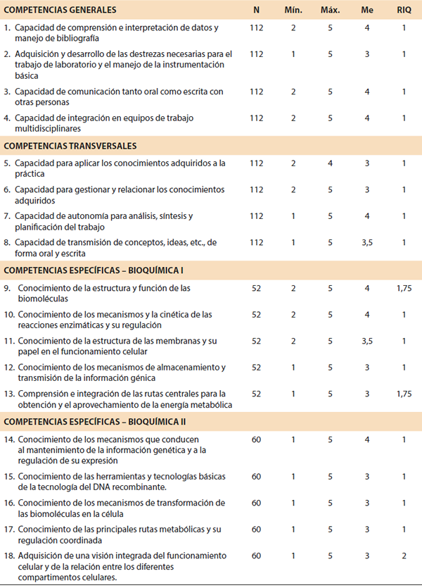Percepción de la adquisición de competencias en la materia de Bioquímica
