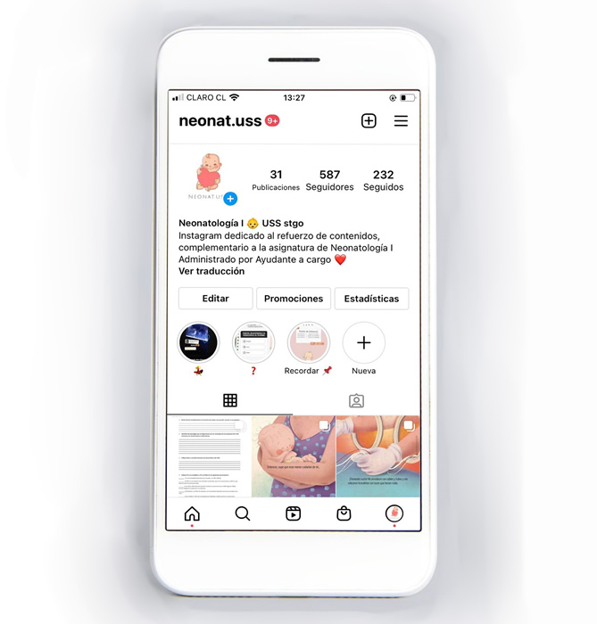 MATERIAL Y MÉTODO Estudio cuantitativo de alcance descriptivo y de corte transversal. La muestra estuvo constituida por 91 estudiantes de Obstetricia de segundo año (2020) de la Universidad San Sebastián (sede Santiago). Se creó una cuenta de Instagram con el nombre “Neonat.uss” (Figura 1) en el contexto de la asignatura Neonatología I en modalidad online, donde se publicó semanalmente información relevante sobre la asignatura: fechas de pruebas, papers, bibliografía, material de apoyo e información sobre las ayudantías. En las historias se publicaron preguntas para reforzar el contenido trabajado en clases. Neonatología I corresponde a una asignatura que contribuye al desarrollo profesional en el ámbito clínico, permitiendo al estudiante determinar los cuidados perinatales que se proporcionan al recién nacido sano.