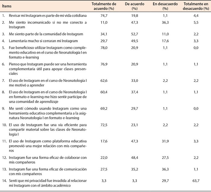 RESULTADOS El uso de Instagram como herramienta de apoyo a la asignatura Neonatología I, en modalidad online en contexto COVID-19, en general fue valorado positivamente por los estudiantes (Tabla 1). En relación a la dimensión “uso cotidiano del Instagram”, un 94,5% de los estudiantes estuvo de acuerdo o muy de acuerdo con “revisar mi Instagram es parte de mi vida cotidiana” y un 86,8% señaló estar de acuerdo o muy de acuerdo con “me siento parte de la comunidad de Instagram”. Respecto a la dimensión “Percepción sobre el uso de Instagram con fines educativos”, 98,9% de los estudiantes se consideró de acuerdo o muy de acuerdo sobre que “Fue beneficioso utilizar Instagram como complemento educativo en el curso de Neonatología I en formato online”. Un 97,8% de los estudiantes estuvo de acuerdo o muy de acuerdo con el indicador “Pienso que Instagram puede ser una herramienta complementaria útil para apoyar clases presenciales”. Por otra parte, un 95,6% estuvo de acuerdo o muy de acuerdo respecto al ítem “El uso de Instagram en el curso de Neonatología I me motivó a aprender”. En esta línea, un 97,8% de los alumnos refirió estar de acuerdo o muy de acuerdo con que “El uso de Instagram en el curso de Neonatología I en formato online me hizo sentir partícipe de una comunidad de aprendizaje”. En este sentido, un 70,4% de los estudiantes estuvo de acuerdo o muy de acuerdo con que “El uso de Instagram como plataforma educativa promovió una mejor relación con sus compañeros”. Respecto a la comunicación, un 62,7% de los estudiantes estuvo de acuerdo o muy de acuerdo con el indicador “Instagram fue una forma eficaz de comunicación con mis compañeros”. También, un 95,6% de los estudiantes estuvo de acuerdo o muy de acuerdo con que “El uso de Instagram fue una vía eficiente para compartir material sobre las clases de Neonatología I”. Finalmente, solo un 6,6% de los estudiantes estuvo de acuerdo o muy de acuerdo con el ítem “Sentí que mi privacidad fue invadida al relacionar mi Instagram con el ámbito académico”.