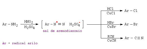 , en una sal de arenodiazonio, por Cl,Br o CN.