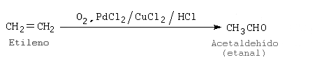 La forma más habitual de obtener acetaldehído es el proceso Wacker, en el cual se hace burbujear etileno y oxígeno en una solución acidificada de PdCl2-CuCl2 :
