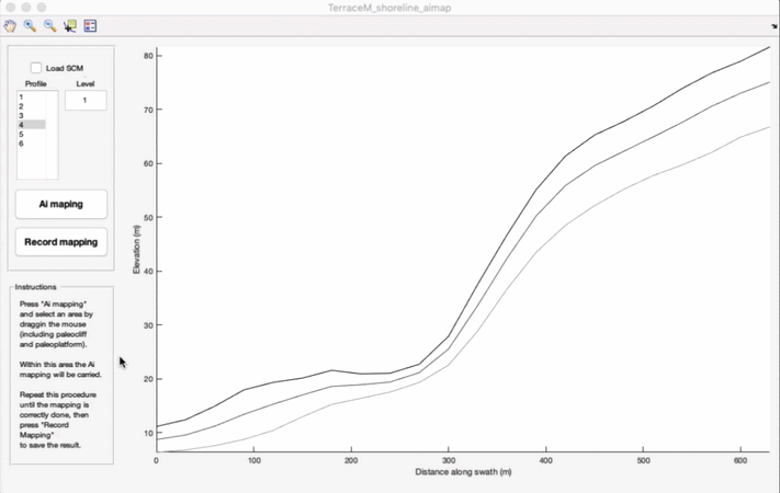 The swath profile mapping interface is an improved GUI that allows mapping and visualizing shoreline angles. TerraceM-2 uses the maximum elevations of swath profiles, which resemble the original coastal terrace morphology without the effects of post-abandonment modification, principally resulting from fluvial incision.